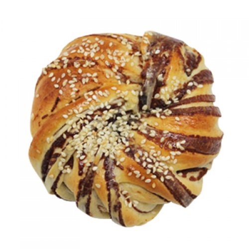 Sweet bun with spiraled red bean filling topped with white sesame.