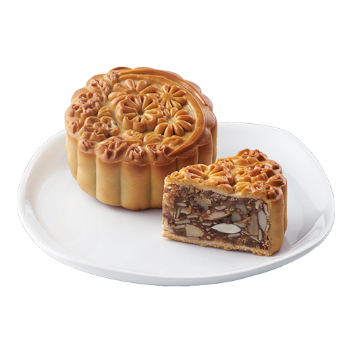 A blend of a variety of nuts such as almond, walnut and melon kernel seeds gives this mooncake a great biting texture. Every bite yields a delightful surprise.